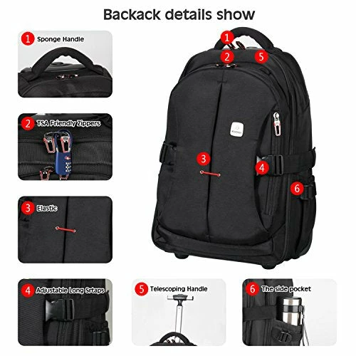 - ✔Dual model to take—Back backpack or use wheels as your need .Hidden padded backpack straps Backpack straps are stored behind the zippered back panel.