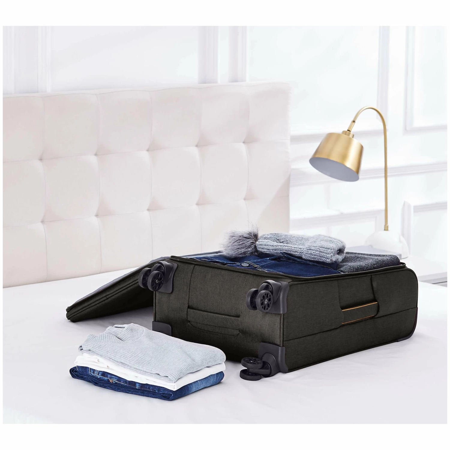 - Softside spinner made of durable 600D polyester with a stylish design for a fashionable, sophisticated appearance