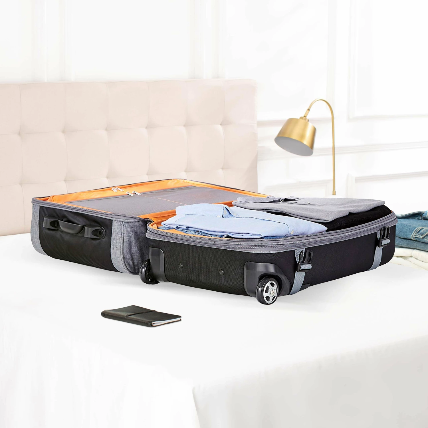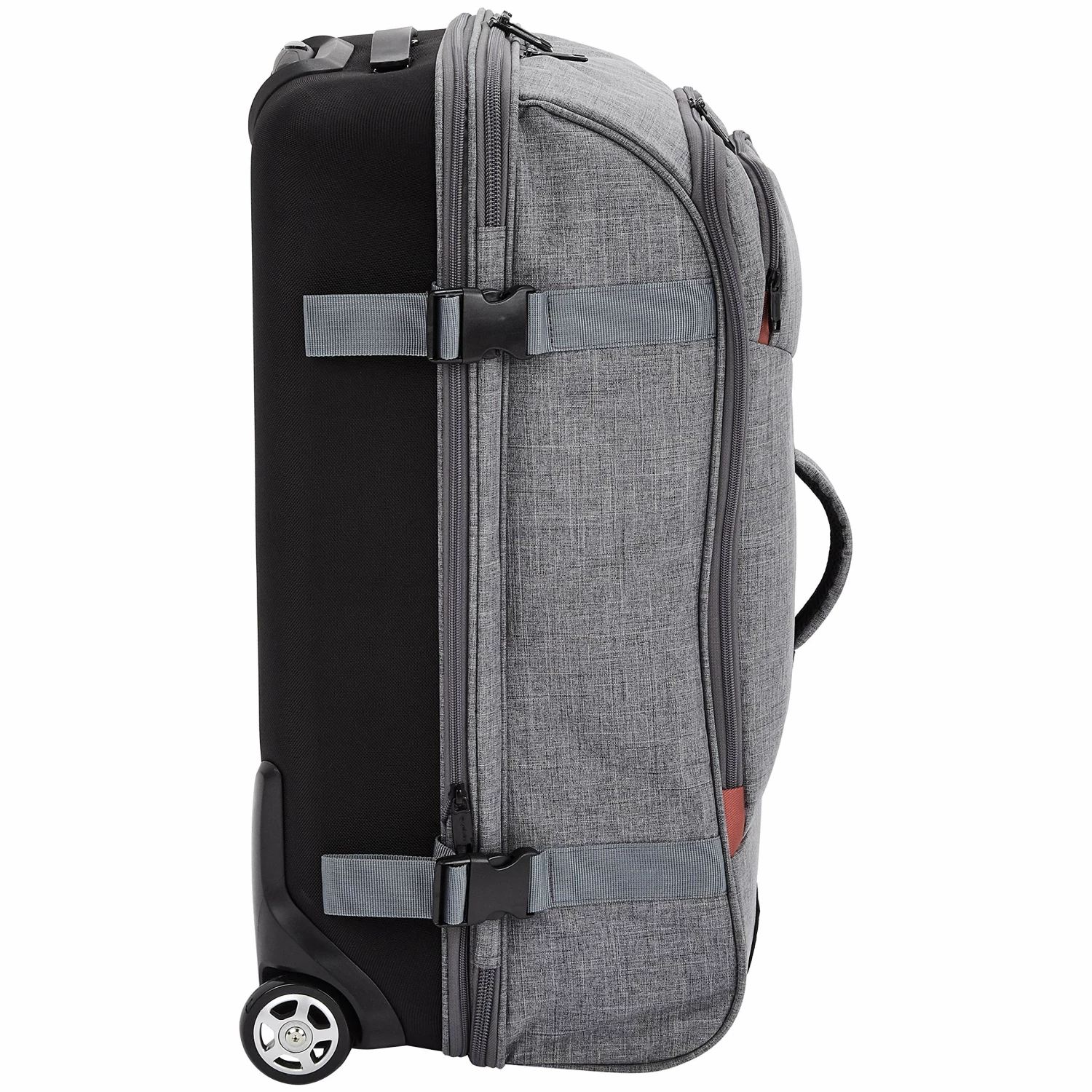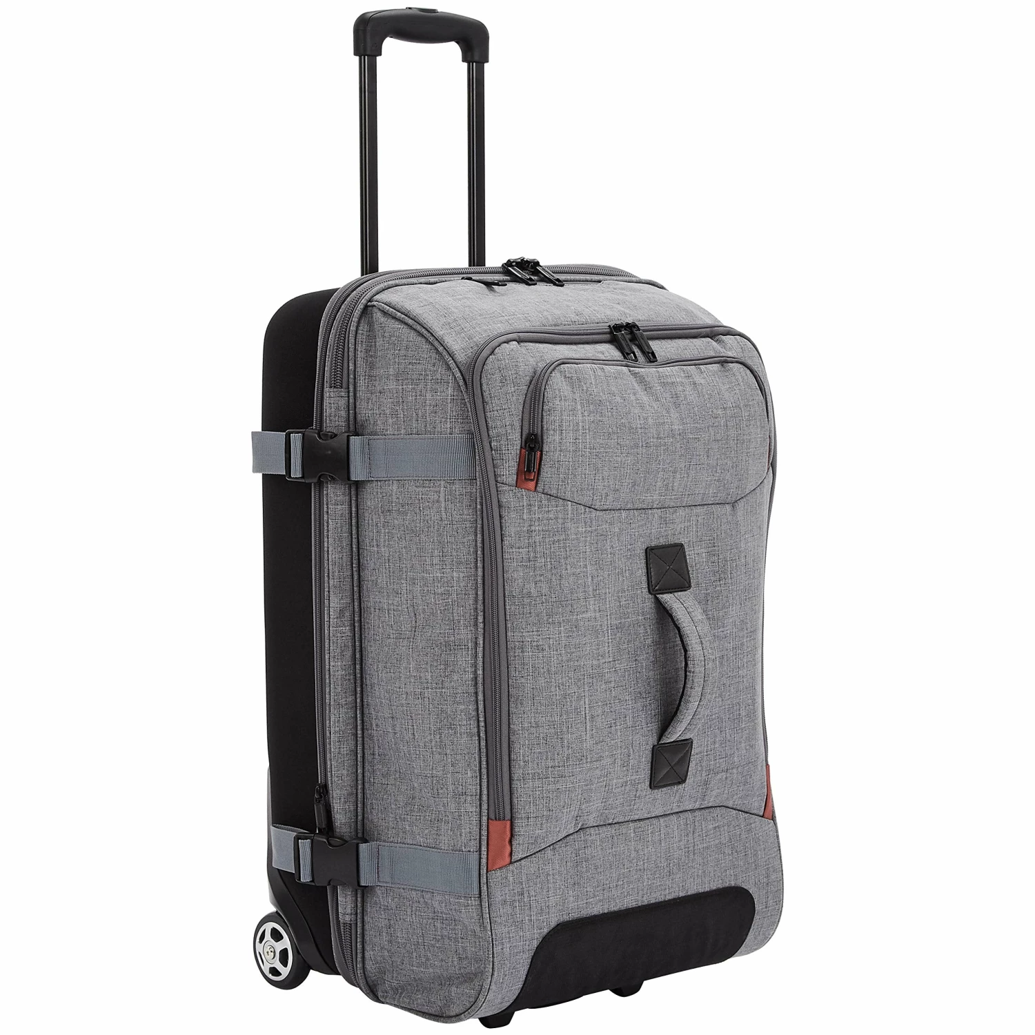 - Telescopic locking handle and front-mounted duffel hand-grip
