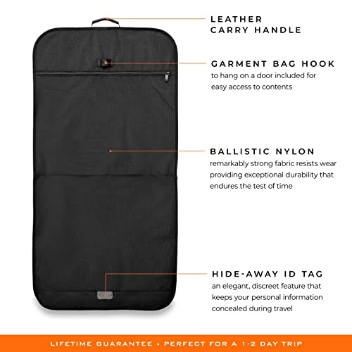 Details: The Briggs & Riley Garment bag (22.5″ x 24.5″ x 2″) provides impeccable protection in a slim design for your hanging formalwear. The convenient T-shape design allows for easy access to your belongings. The garment bag also comes with a hide-away ID tag that discreetly keeps your personal information concealed during travel. Bag can be cleaned with a soft, damp cloth or an adhesive lint brush roller. If your bag is ever broken or damaged, we’ll repair it free of charge, no proof of purchase needed, no questions asked.