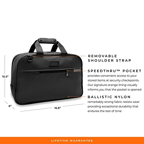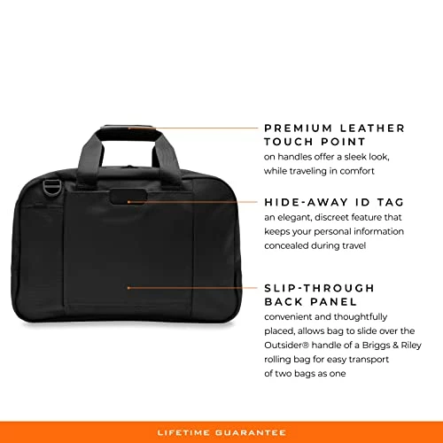 Details: The Briggs & Riley Duffle bag (10.5″ x 16.8″ x 8″) offers enough storage for all your tech accessories and space to accommodate a change of clothes. Premium leather touchpoints on the top carry handles add comfort and style to your travel. The duffle also comes with an adjustable/removable shoulder strap and a hide-away ID tag that discreetly keeps your personal information concealed during travel. Bag can be cleaned with a soft, damp cloth or an adhesive lint brush roller. If your bag is ever broken or damaged, we’ll repair it free of charge, no proof of purchase needed, no questions asked.