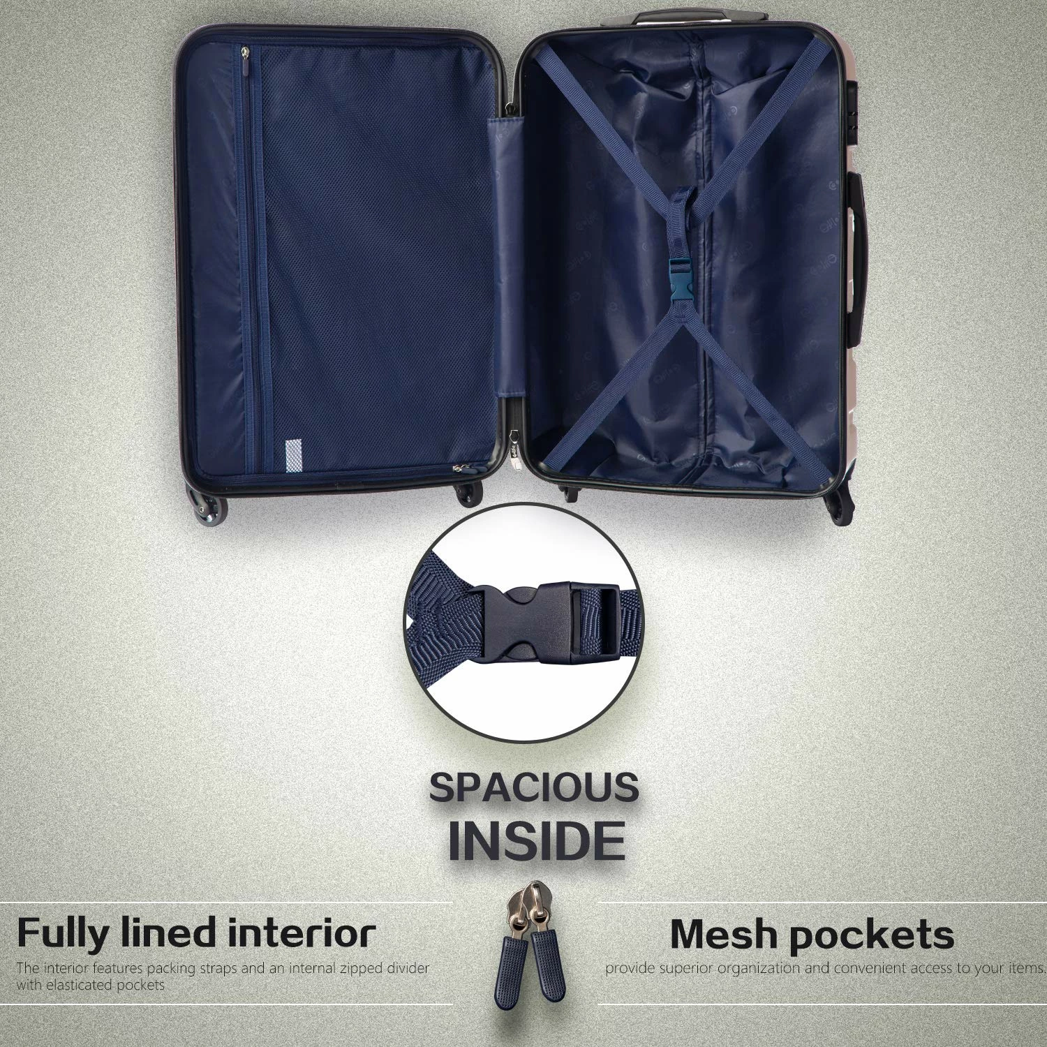 This 3 piece suitcase set features one 28inch suitcase, one 24inch suitcase for checking in and one 20inch suitcase suitable for carrying onto the plane.They are made of 100% ABS.The major benefits of this material. it is extremely lightweight, durable, which can protect the contents of your luggage. The multi-directional spinner wheels rotate 360 degrees for easy maneuverability. This luggage allows you to pack more while avoiding the excess weight surcharges imposed by most airlines. Modern internal chrome telescoping handle with push button handle. Interior mesh and zip pocket and elastic pocket.