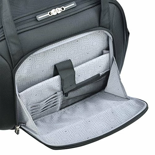 Details: This under-sweater combines style, quality and convenience, in a bag designed to fit under the seat of most airline seats and maximize organization. This bag is made from durable material for long-lasting use. A top and bottom carry handle provide comfort when lifting a fully packed case. The interior includes shoe pockets and a mesh pocket within the main compartment. The exterior of the bag features a water resistant pocket and lined pocket on the sides of the case which provide additional organization.The front zippered pocket is perfect for last minute items. An adjustable height trolley system and smooth rolling in-line skate wheels allow for easy travel. Interlocking zippers allow you to secure the contents of the bag with a lock. A smart band on the back of the bag allows you to slide over the trolley system of another piece of luggage. Worldwide limited 10 year warranty.