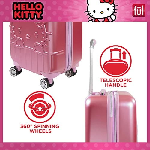 - HELLO KITTY ROLLING LUGGAGE: Pink hardshell luggage with a cute Hello Kitty design; Hardside luggage carrier meets most airline requirements for carry-on luggage and fits into most overhead bins