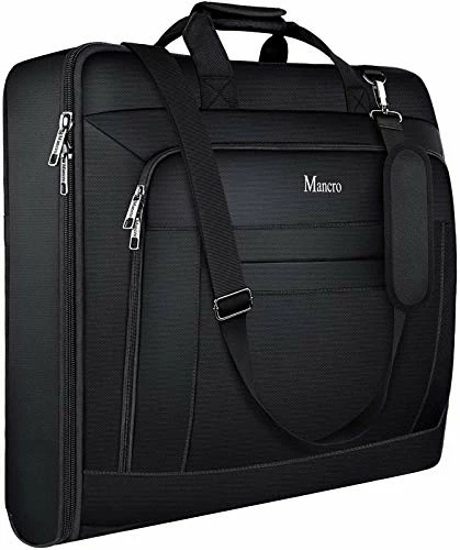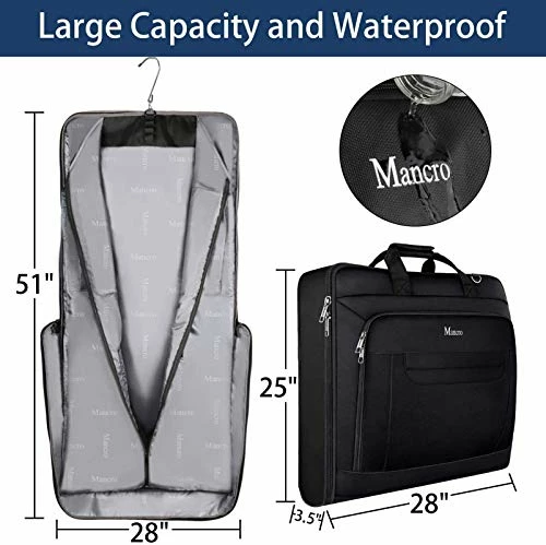 - â–¶CARRY ON 40L GARMENT BAG: Best suit garment bag size 28″L x 25″W x 3.5″H. Side garment bag meets airport size Requirements (length + width + height: cannot exceed 62 inches). Detachable shoulder strap adjustable, versatility and comfort make this dress garment travel bag fit your shoulder. Bring your Mancro carry on garment bag for easy travel. This folding travel garment bag will be your best choice and it is a good gift for men and women. It is a good suit bag for men travel