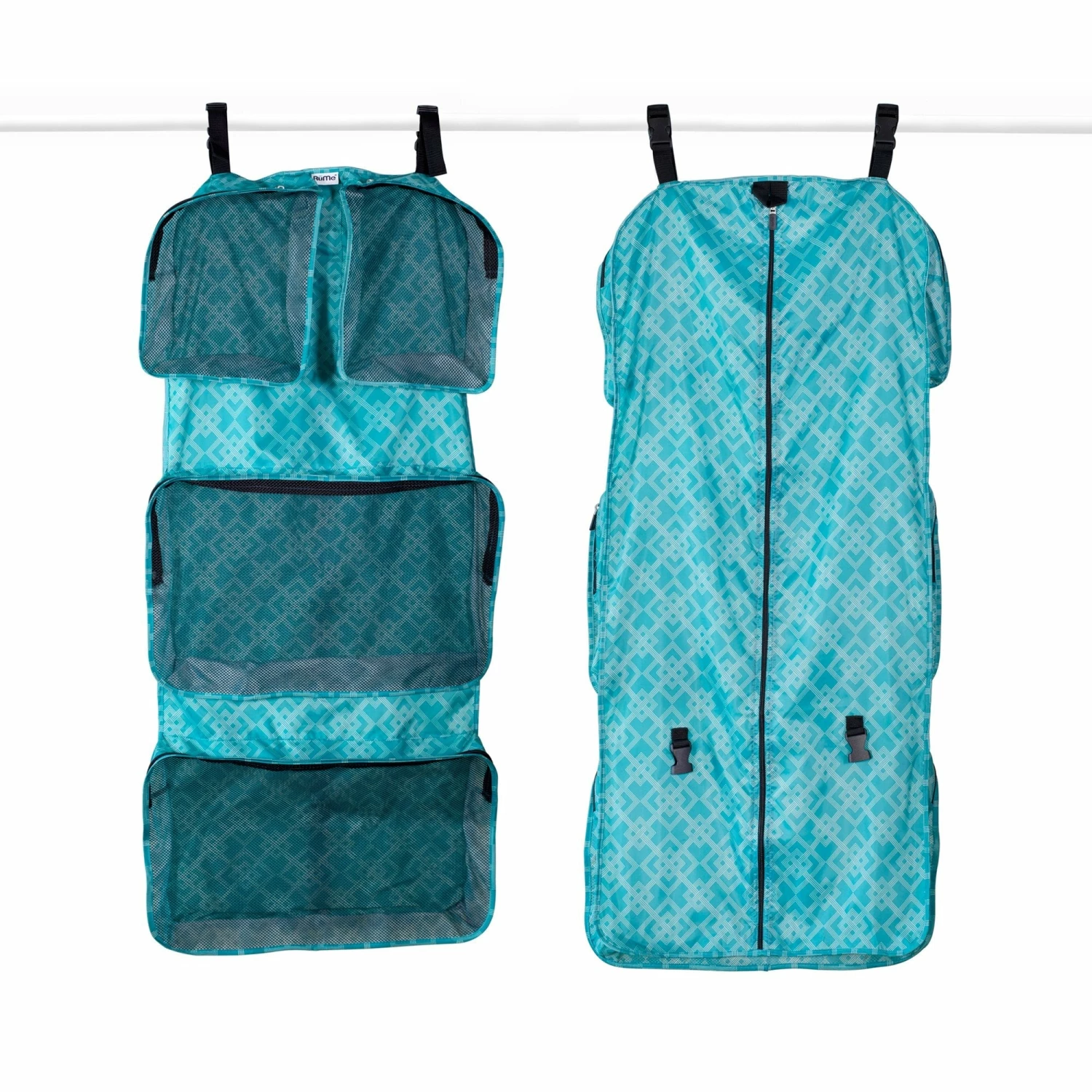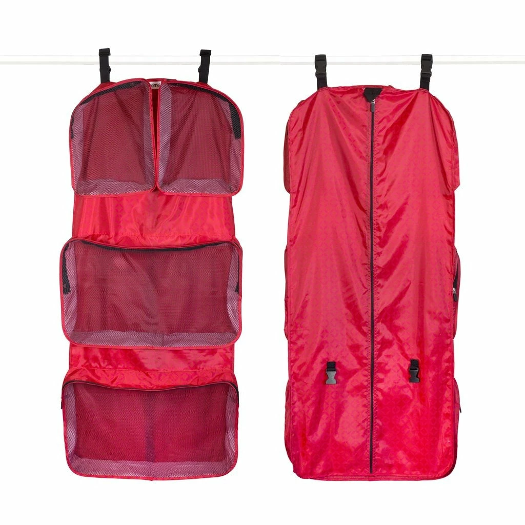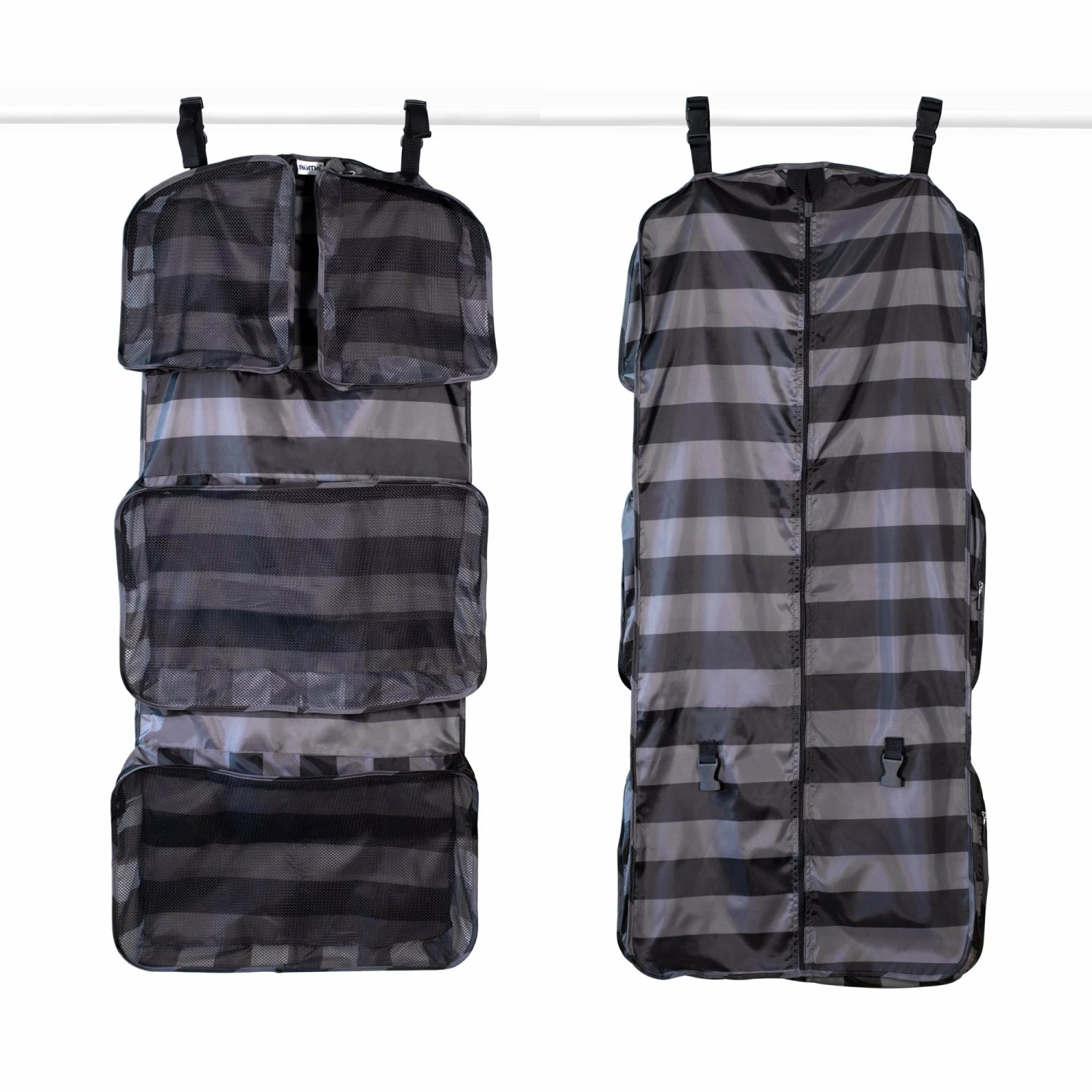 Bye-bye suitcase wrinkles and packing frustration; hello, GTO! The RuMe Garment Travel Organizer (GTO) transforms your packing, unpacking and living-away-from-home process. The two-sided travel bag enables you to pack suits and dresses lengthwise on hangers. Then, flip the bag over and pack other essentials in one of four packing cubes. See-through pockets make it easy to find the items you need, and two buckles secure the bag when folded or enable you to hang the GTO from a closet rod.Â