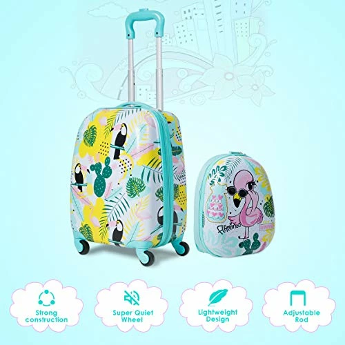 - 🦩【2 Pcs Kids Luggage Set】: This kids luggage set includes a 12” travel backpack and 16” toddler suitcase, perfect size to be put in the overhead compartment of the plane or under the seat on an airplane. And this luggage set weighs 5 lbs, perfect for kids to wheel on their own without needing assistance.