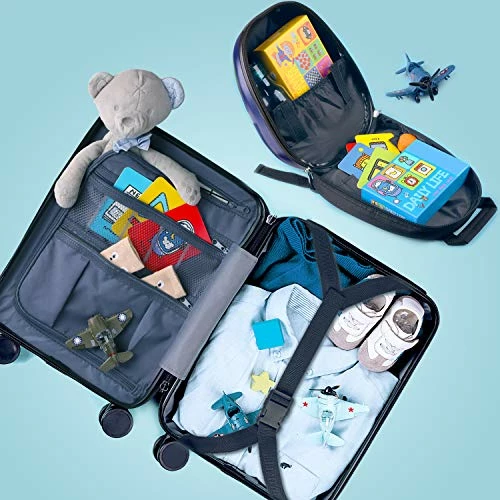 iPlay iLearn Kids Lightweight Luggage Set, 18” Durable Carry on Suitcase, Hard Shell Backpack, Hardside Upright Travel Trolley ABS with Spinner Wheels for 2, 3, 4, 5, 6 Year Olds Boys Children Girls