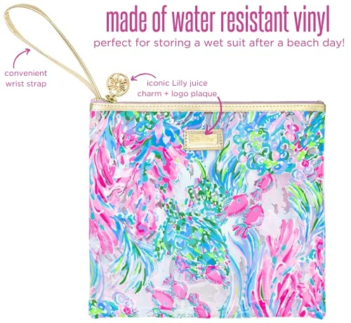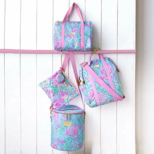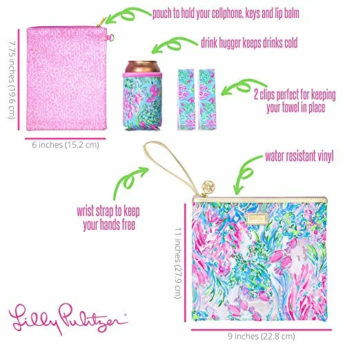 - Beach day pouch is featured in the pink/blue Lilly Pulitzer print, Best Fishes, and comes packed full with all the essentials – 2 towel chair clips, insulated drink sleeve, and a nylon zip bag – to make your getaway a breeze