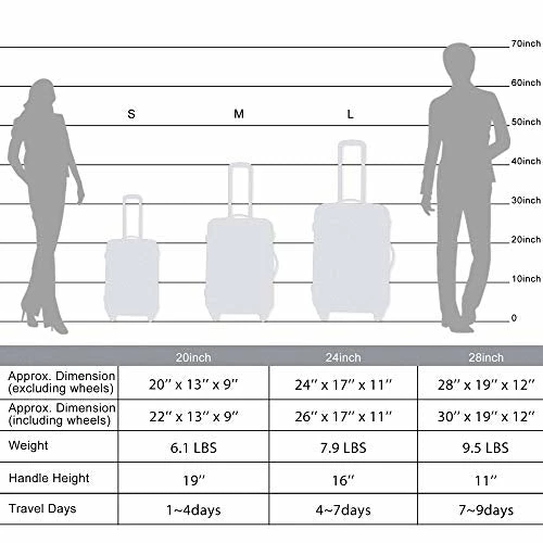 Details: Specifications: Size S Approx. Dimension (excluding whees): 18.9″ x 16″ x 9.5″ Approx. Dimension (including whees): 21.3″ x 16″ x 9.5″ Weight: 6.6 LBS Handle Height: 19.7″ Travel Days: 1~4 days Size M Approx. Dimension (excluding whees): 22.8″ x 18″ x 11″ Approx. Dimension (including whees): 25.2″ x 18″ x 11″ Weight: 8 LBS Handle Height: 15.7″ Travel Days: 4~7 days Size L Approx. Dimension (excluding whees): 26.8″ x 20.5″ x 12.6″ Approx. Dimension (including whees): 29.1″ x 20.5″ x 12.6″ Weight: 10 LBS Handle Height: 11.8″ Travel Days: 7~9 days