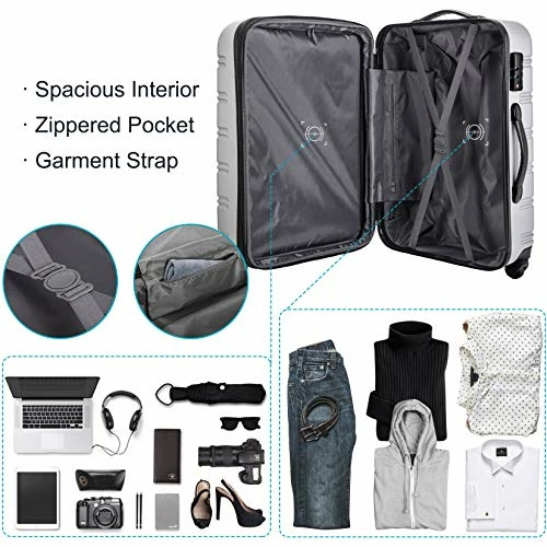 Details: Designed to provide travelers comfort, functionality, reliability, and peace of mind, this 3 piece suitcase set features one 28inch expandable suitcase for consignment, one 24inch expandable suitcase for checking in and one 20inch suitcase(not expandable) suitable for carrying onto the plane. Constructed with lightweight durable ABS + PC color masterbatch hard shell material, this luggage is durable, flexible and can absorb impact when under stress. Quiet airplane spinner wheels and an adjustable 3-level telescoping handle allow you to quickly maneuver in tight spaces and provide effortless movement. Unique hardshell material not only protect your belongings, but also enhance overall durability. Hide any potential scratches or scuffs from your journeys with elegant embossed patterns. With the included 3- digit combination lock, you can also secure your valuables from thieves. Make packing clothes easy with the interior fully lined with multi-use organizational pockets.