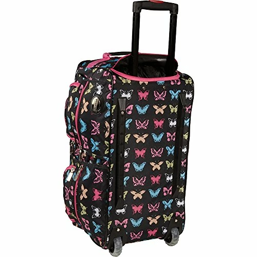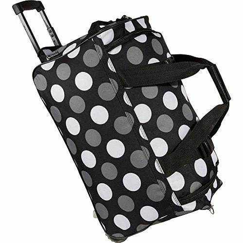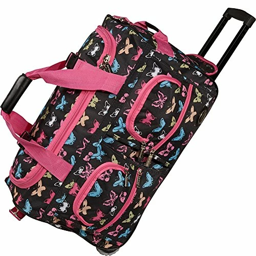 Details: Travel in style with this great soft-sided rolling duffle bag. Bag features a heavy duty polyester construction. Inline skate wheels for superior mobility, internal retractable hide-away handle system, u-top opening provides easy access to roomy zipper secured main compartment. Two front zipper-secured compartments, adjustable ergonomic shoulder strap. Made of 600 denier heavy duty polyester. Measures 22″ L x 12″ W x 11″ H