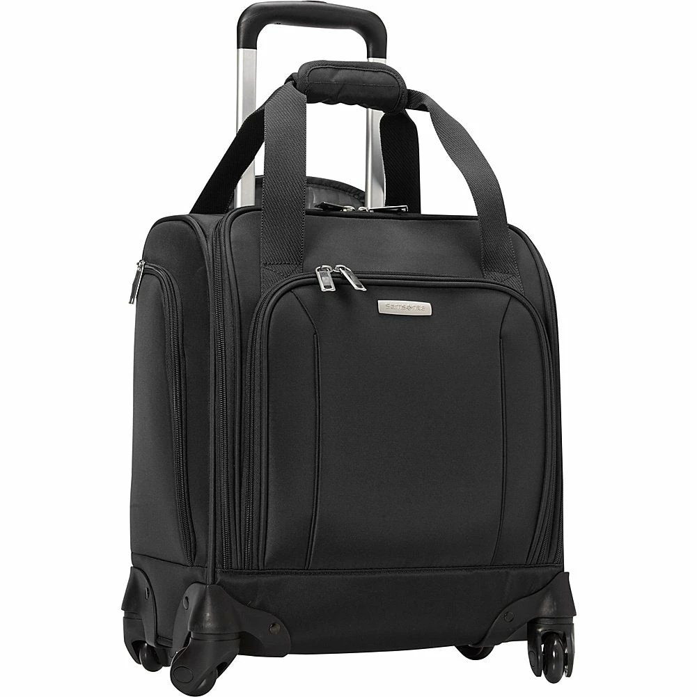Details: With its small shape and underseat design, this carry-on bag is perfect for the modern traveler on the go. The Samsonite Spinner Underseater with USB Port – eBags Exclusive is constructed from durable polyester fabric and features a telescoping pull handle, four multi-directional spinner wheels, and an integrated USB charging port so you can charge your smartphone and tablet when you’re away from home. Sized to fit under most airline seats, this spinner includes multiple exterior pockets, a laptop sleeve, a tablet sleeve, a side water bottle pocket, and an inside mesh zipper pocket. A front organizer is loaded with pockets to hold small accessories and includes two pen holders and four convenient card slots.