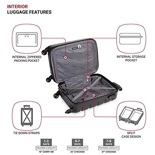 Details: Travel in style with the SwissGear 7366 Expandable Hardside Luggage Set. Both modern and utilitarian, its lustrous metal zippers and rugged construction exemplify its long-lasting quality. The set contains the 18” Carry-On, 23” and a 27″ Expandable Hardside Luggage. Its almost indestructible split case opens to display the main compartment equipped with tie-down clothing straps, a roomy zippered lid pocket, and a large zippered packing pocket to keep your travel-sized essentials separate from your clothes. It also includes a premium steel locking handle, four 360-degree wheels, expandable packing space, and a molded grab handle. Guaranteeing extra security with its built-in TSA-approved three-dial combination lock, make this a go-to for your upcoming voyage because, whether traveling for business or pleasure, this is doing adventure the right way.