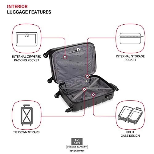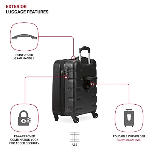 Details: Travel in style with the SWISSGEAR 7366 18” Expandable Carry-On Hardside Spinner Luggage coloring your next adventure. Small in stature yet grand in a modern and utilitarian way, its lustrous metal zippers and rugged ABS construction exemplify its long-lasting quality. Its virtually-indestructible split case opens to display tie-down clothing straps, a roomy zippered compartment and a small zippered pocket to keep your travel-sized essentials separate from your clothes. The 18” Expandable Hardside Luggage also includes a telescopic handle, four 360-degree wheels, expandable packing space, and a molded grab handle, spin it around to take advantage of the additional mobility its foldable cup holder provides. The extra security its built-in TSA-approved three-dial combination lock provides makes this suitcase a must-have for your upcoming voyage because, whether traveling for business or pleasure, this is finally doing adventure the right way.