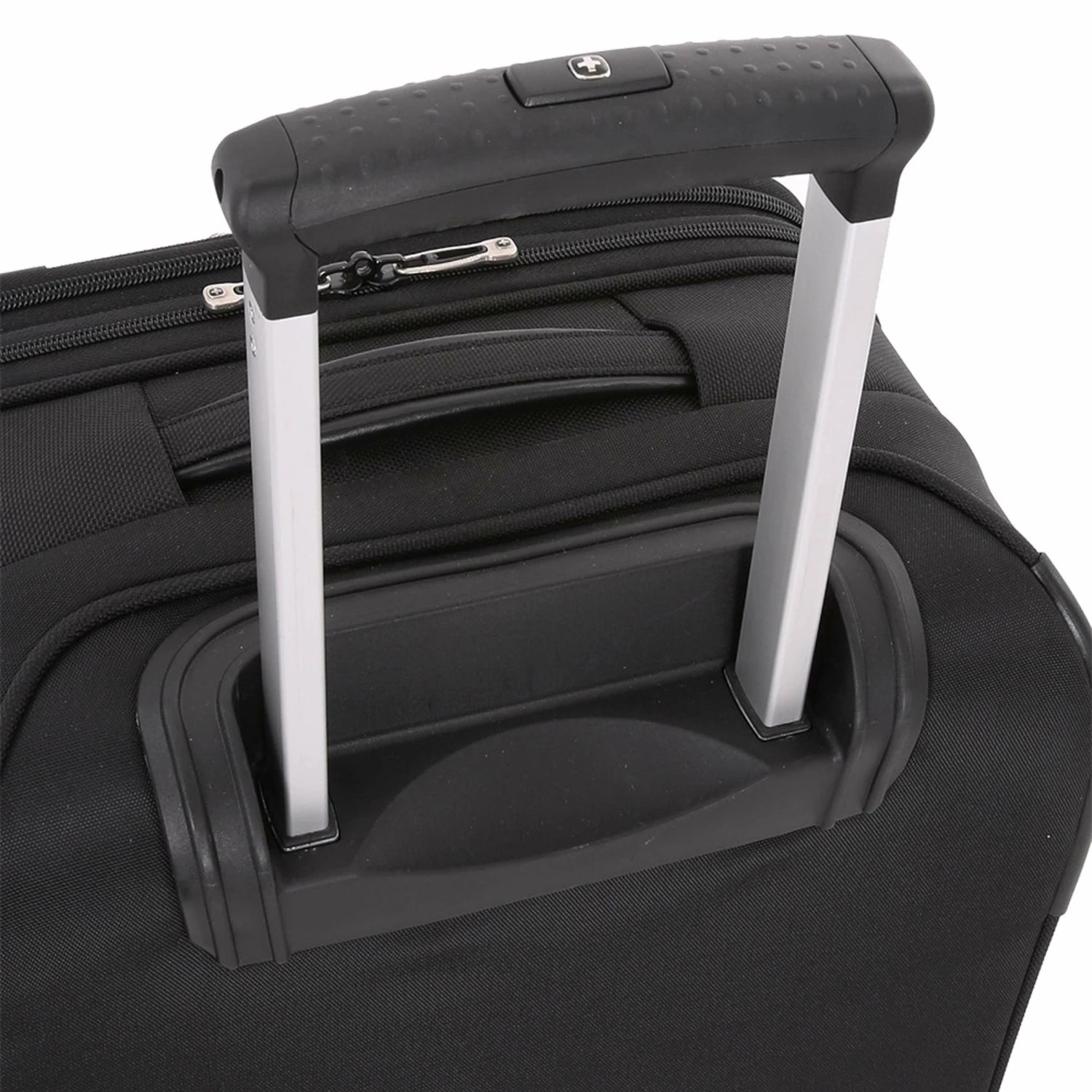 Details: A refined bag with a distinct business style, this Swissgear 6590 18″ Geneva Wheeled Carry-On Luggage features a sturdy body draped in premium quality 1680D ballistic polyester. Its wide, maintenance-free wheels provide a smooth ride, while its large belly, armed with garment compression panels, expands to accommodate days’ worth of essentials. A built-in wet bag and front zippered pouch contribute to the case’s smart organization. Pull up the deluxe telescoping handle and roll on to your destination.