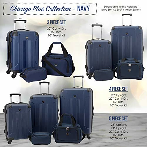 Details: Chicago plus series features the hardside spinner luggage as well as a boarding tote and travel kit to complement every travelers requirements. 3 piece set 20 expandable carry-on spinner 15 boarding tote 10 travel kit 4 piece set 28 expandable spinner suitcase 20 expandable carry-on spinner 15 boarding tote 10 travel kit 5 piece set 28 expandable spinner suitcase 24 expandable spinner suitcase 20 expandable carry-on spinner 15 boarding tote 10 travel kit