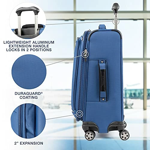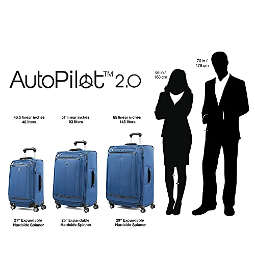Details: Take this 3- piece spinner set for a spin. The Travelpro®AutoPilot™ 2.0 3-Piece Expandable Spinner Set” Expandable lets you pack for a week or more with a tapered expansion option that gives you up to 2” more packing capacity in a tip-resistant design. Plus, the interior lid pocket, water-resistant side pocket and adjustable hold down straps keep everything organized and in its place. A honeycomb frame system provides durability without extra weight, while the unique bottom tray construction helps align and stabilize the eight 360° spinner wheels–for effortless maneuverability and enhanced toughness. A telescoping extension handle adjusts to users of different heights and features an ergonomic, Patented Contour Grip for a great handhold and easy steering. Treated to resist moisture and stains inside and out, this bag is built to last and backed by our Limited Lifetime Warranty