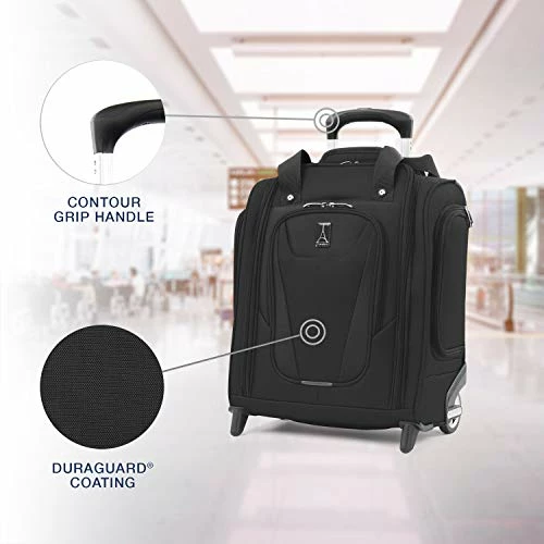- Compact, wheeled underseat carry on bag is designed for organization, mobility and convenience; Polyester fabric with stain resistant, water repellant duraguard coating and ergonomic, high tensile strength zipper pulls provide lasting durability