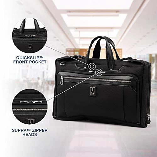 Details: Compact, convenient, creaseless! The Travelpro Platinum Elite Tri-Fold Carry-On Garment Bag is the perfect grab-and-go garment bag for quick trips, keeping suits, shirts and dresses protected and crumple-free. Luxury styling includes premium fabrics with leather trim and chrome zippers along with padded interior roll bars to protect clothes from wrinkles. Multiple interior pockets accommodate folded clothing, accessories and more with excellent packing capacity, while a removable, quart-size wet pocket is TSA compliant and perfect for toiletries. Large exterior pocket gives you quick access to a tablet and our Travelpro QuickSlip front pocket with magnetic closure keeps essentials like cell phone stored while going through security. Backed by our Built for a Lifetime Limited Worry Free Warranty.