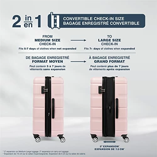 - The Convertible Medium-Large Checked Spinner in this hardside luggage set is a medium-sized bag that features a unique 3” expansion option that increases the bag’s capacity and size to a large check-in spinner (62 linear inches). Carry on suitcase has a 2″ expansion option for added capacity.