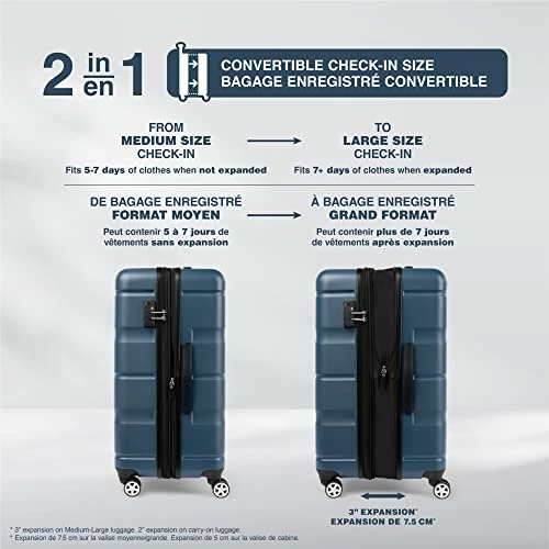 - The Convertible Medium-Large Checked Spinner in this hardside luggage set is a medium-sized bag that features a unique 3” expansion option that increases the bag’s capacity and size to a large check-in spinner (62 linear inches). Carry on suitcase has a 2″ expansion option for added capacity.