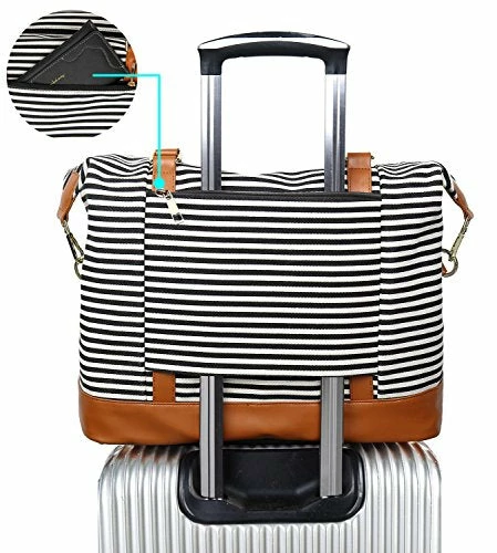 - Great size as small overnight bag, short journey bag, daily use shoulder bag, gym tote bag also as school bag, work bag, day trips. Back side sleeve allows you to slide it over rolling suitcase/luggage/roller bag handle.